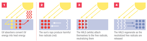 UV Absorberare tar upp skadliga UV- strålar från solen och omvandlar dem till värme som avgår från lackytan (1). Hindered Amine Light Stabilisers (HALS) skyddar bindemedlet i lacken från att kemiskt brytas ner genom att neutralisera de fotokemiskt bildade fria radikaler som annars kan ställa till stor skada. HALS återproducerar sig själv i denna process och skyddar därför lacken under hela dess livslängd (2-4).